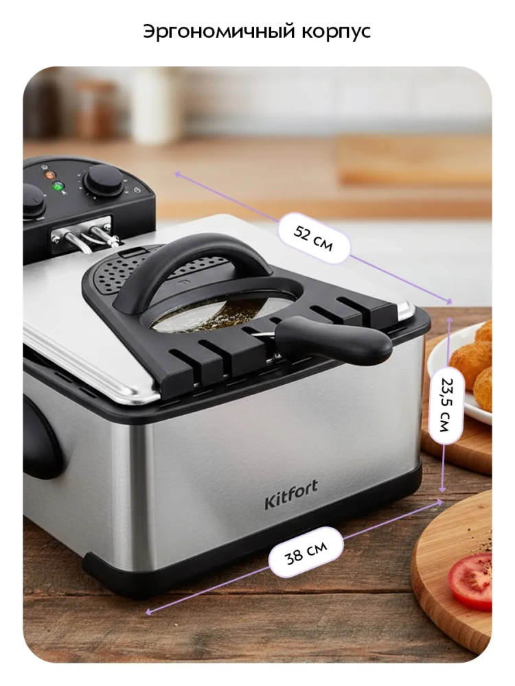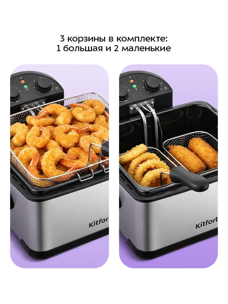 Фритюрница Kitfort КТ-6538 предназначена для приготовления продуктов в горячем масле. Прибор позволит вам в домашних условиях приготовить любимые блюда: картофель фри, пончики, чебуреки или куриные крылышки. Также во фритюрнице можно жарить овощи, рыбу, мясо и морепродукты в кляре и без.