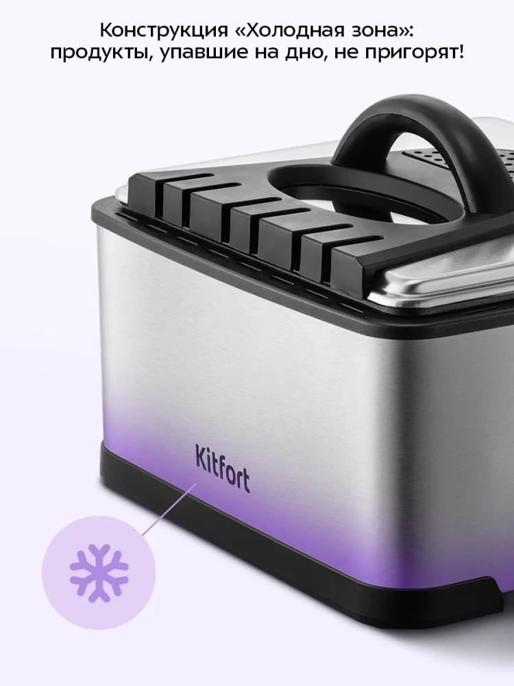 Ручки с обеих сторон корпуса позволяют удобно переносить фритюрницу. Для устойчивости прибор оснащен нескользящими силиконовыми ножками. В крышке фритюрницы имеется смотровое окно, через которое вы сможете следить за готовностью блюда, не поднимая крышку.