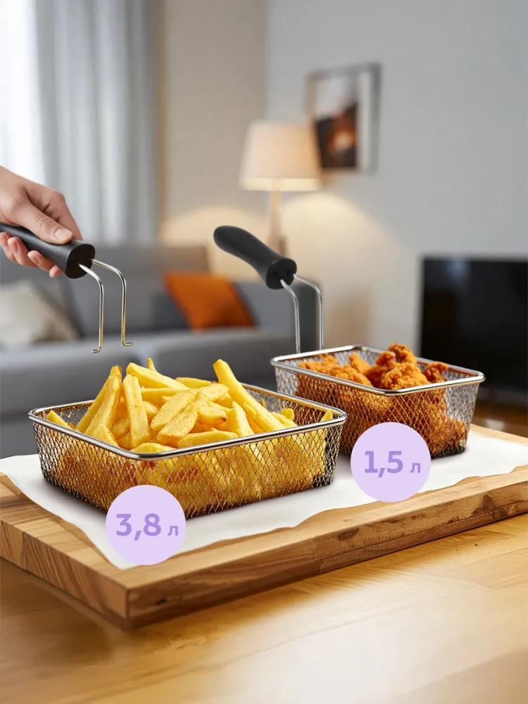 В комплекте три корзины для жарки: одна большая и две малые. Для удобства хранения ручки корзин снимаются.