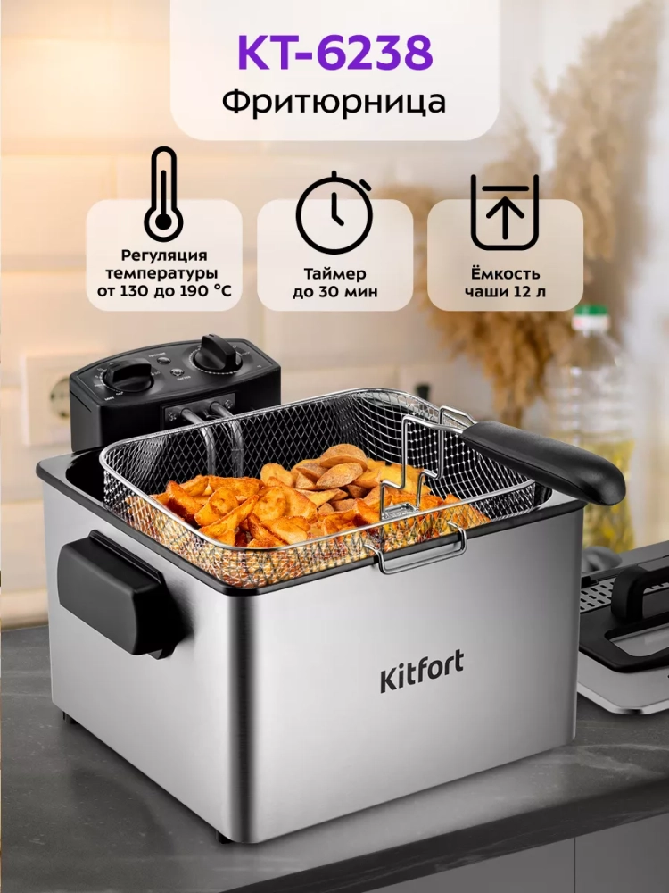 Фритюрница Kitfort КТ-6238 предназначена для приготовления продуктов в слое горячего масла. Прибор позволит вам приготовить любимые блюда, такие как картофель фри, пончики, чебуреки и куриные крылышки, в домашних условиях. Также можно жарить овощи, рыбу, мясо и морепродукты в кляре и без.