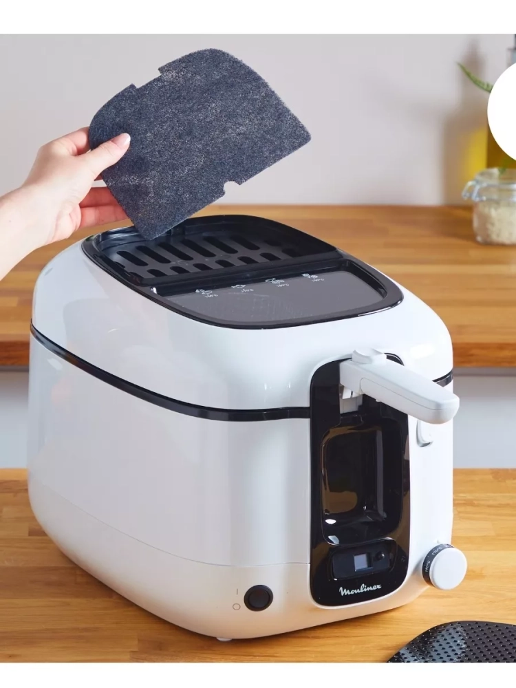 Долговечный сменный угольный фильтр надежно задерживает неприятные запахи. Специальный дизайн рукоятки помогает защитить руки от брызг масла. Встроенный цифровой таймер и большое смотровое окно для точного контроля процесса приготовления. Настройки температуры до 190 градусов для идеального результата при использовании разных ингредиентов.