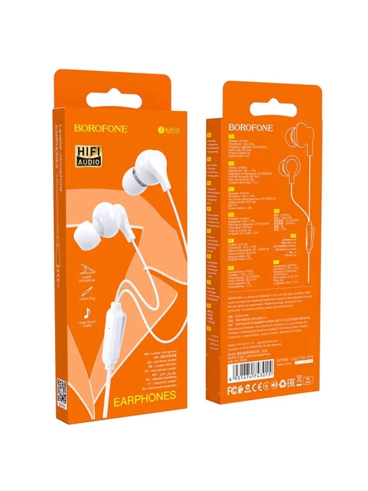 Borofone BM59 Collar – стильные наушники с вкладышами эргономичной формы. Подключаются к гаджетам в разъем 3.5 мм. Вкладываются точно внутрь уха, располагаются не так близко к барабанной перепонке, как внутриканальные, и не вызывают дискомфортных ощущений при продолжительном ношении. Наушники позволяют не только слушать музыку и аудиокниги, но и ответить на телефонный звонок.