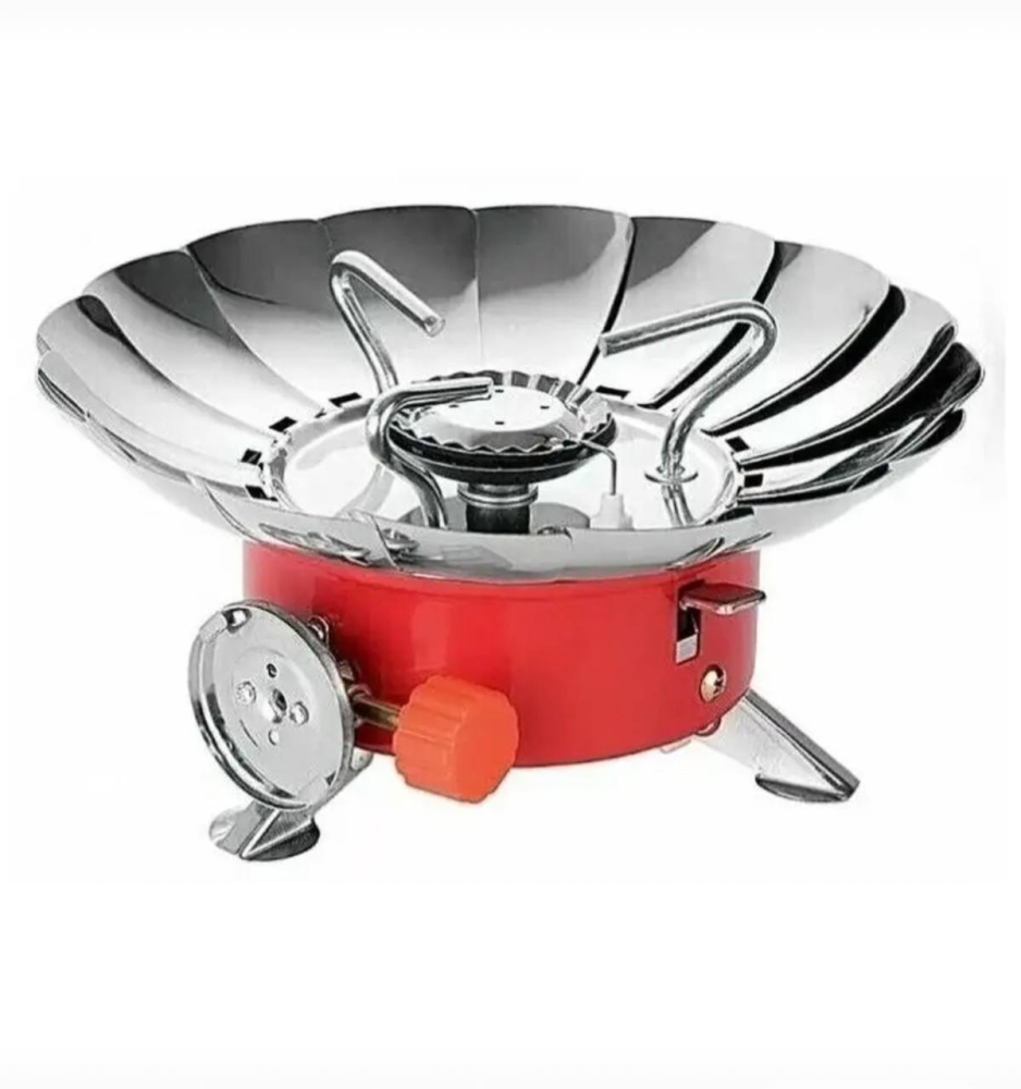 Походная печь для приготовления еды - компактная туристическая плита для газовых баллончиков, идеально подходящая для использования на открытом воздухе. Туристическое снаряжение для туризма походная кухня идеально подходит для туризма, походов, кемпинга, для рыбалки и охоты. Благодаря небольшим размерам и новаторскому дизайну плитка газовая туристическая будет работать в любых условиях. Газовая плита для кемпинга изготовлена из прочной нержавеющей стали. Туристическую плитку легко и просто подключить к газовому баллону (баллон приобретается отдельно), также есть вентиль для регулировки мощности подачи газа. Гарелка имеет 4 крепких, складных дужки, а вся конструкция размещена на складных ножках, благодаря которым мы легко можем разобрать и спрятать в рюкзаке. Веерная портативная газовая горелки и газовая горелка мини оснащена чехлом, пьезоподжигом и защитой от утечки газа. У туристической портативной горелки присутствует пьезоподжиг, что значительно сокращает потраченное время и силы на розжиг костра и приготовление еды или напитков. Мощность горелки около 2,8 кВт. Время приготовления литра H2O: примерно 6 минут. Газовая плита туристическая спортивный товар имеют безопасную систему крепления картриджа. Газовые плитки, горелки и нагреватели имеют плавное регулирование пламени. Картриджа хватает до 110 минут непрерывной работы печи в зависимости от настройки горелки. Наша походная плитка выручит Вас в любых погодных условиях и местах, где нельзя разводить огонь.