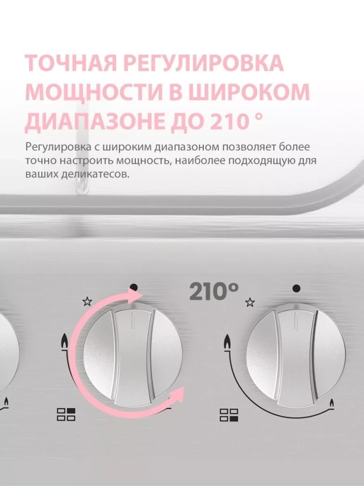 Панель оснащена автоматическим электроподжигом и газ-контролем конфорок, что обеспечивает абсолютную безопасность и удобство использования.