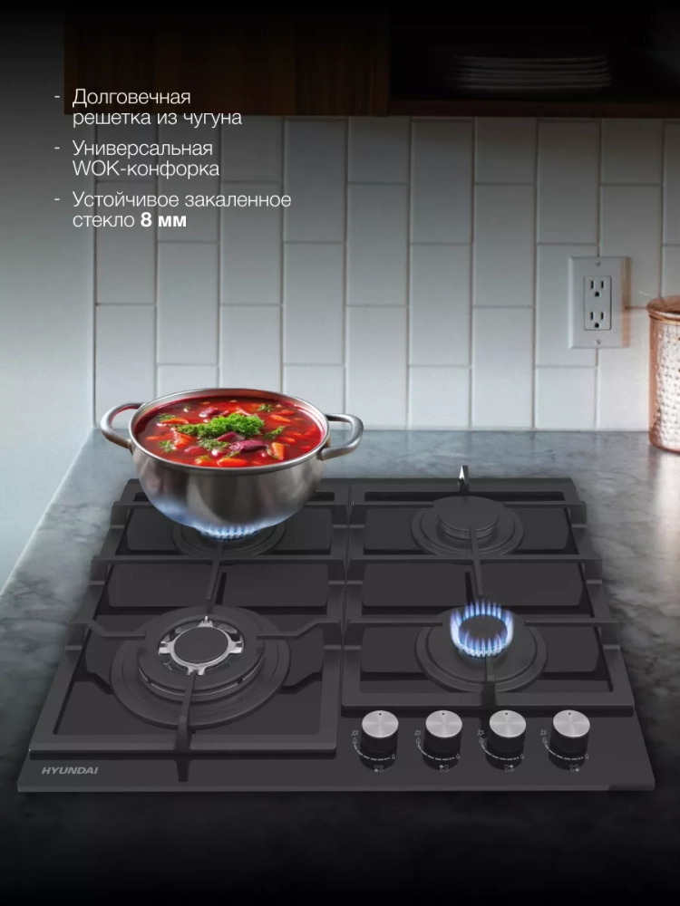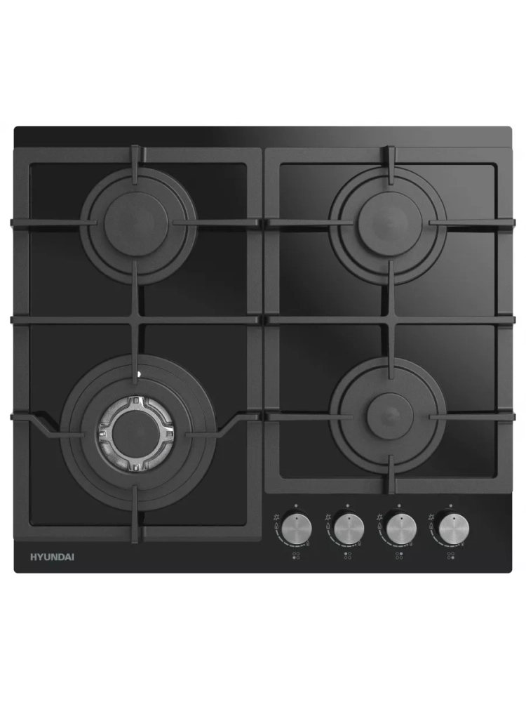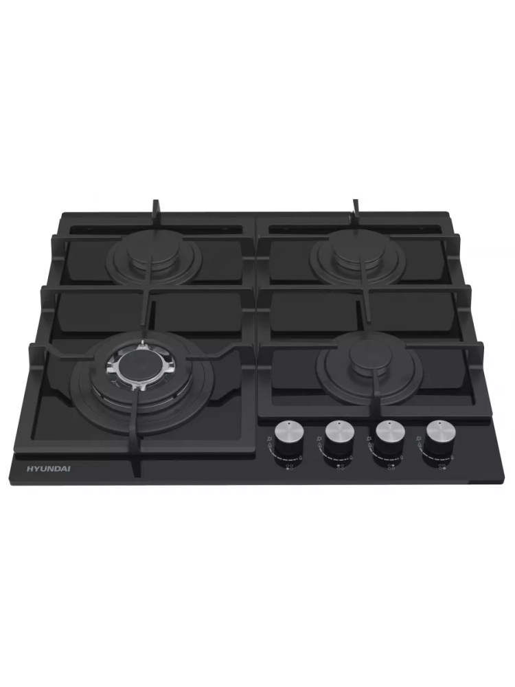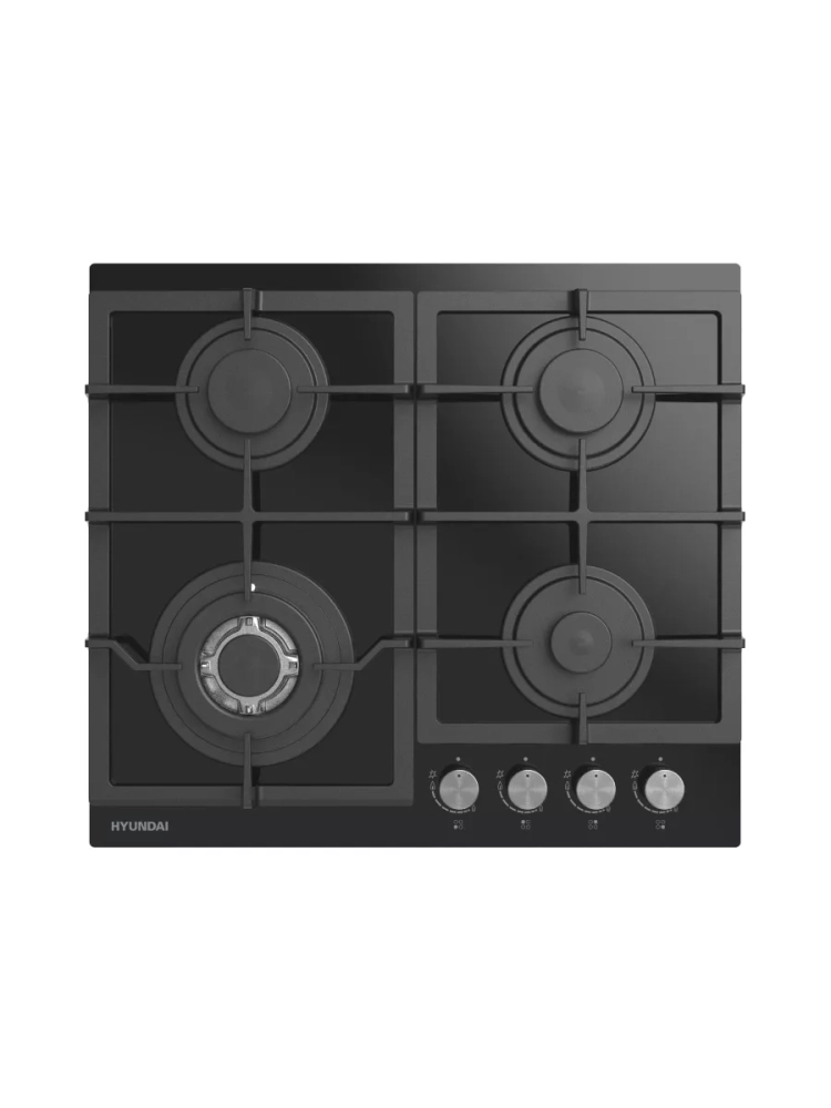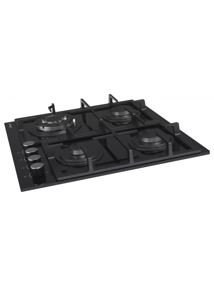 Поверхность выполнена из закаленного стекла черного цвета. Чугунные решетки обеспечивают надежную опору для посуды и просты в уходе. Поворотные переключатели выполнены из металла. Автоматический электроподжиг позволяет легко и безопасно включать конфорки.