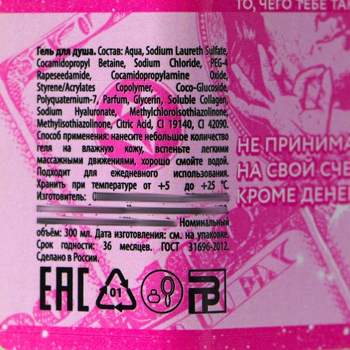 СОСТАВ: Aqua, Sodium Laureth Sulfate, Cocamidopropyl Betaine, Sodium Chloride, PEG-4 Rapeseedamide, Cocamidopropylamine Oxide, Styrene/Acrylates Copolymer, Coco-Glucoside, Polyquaternium-7, Parfum, Glycerin, Soluble Collagen, Sodium Hyaluronate, Methylchloroisothiazolinone, Methylisothiazolinone, Citric Acid, CI 19140, CI 42090.