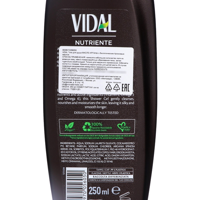 Гель для душа VIDAL с биологическим аргановым маслом, 250 мл