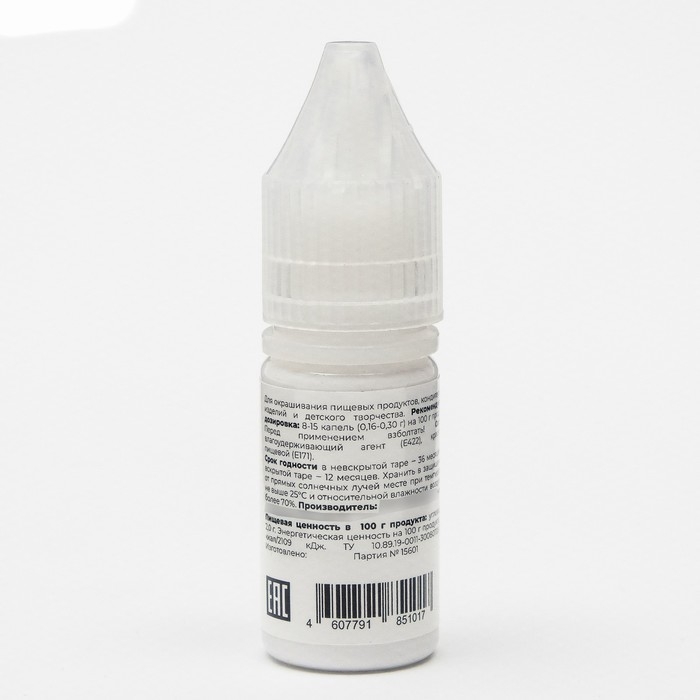Область применения: для окрашивания продуктов питания и различных кондитерских изделий (теста, мастики, айсинга, марципана, крема и так далее), а также для детского творчества (мыловарение, слаймы).