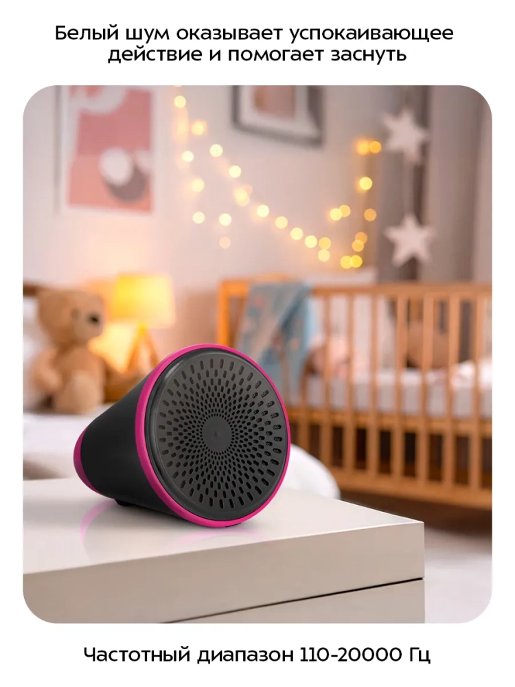 Белый шум — это фоновый звук, в котором есть и высокие, и средние, и низкие частоты, они распределены равномерно и звучат без каких-либо изменений громкости. Использование белого шума позволит приглушить другие не слишком громкие, но неравномерные звуки, такие как разговоры или шум с улицы. За счет этого белый шум способствует снижению уровня стресса и утомления и улучшает концентрацию внимания, а также помогает расслабиться перед сном. Однако не рекомендуется использовать прибор слишком часто, чтобы избежать формирования привычки засыпать под белый шум.