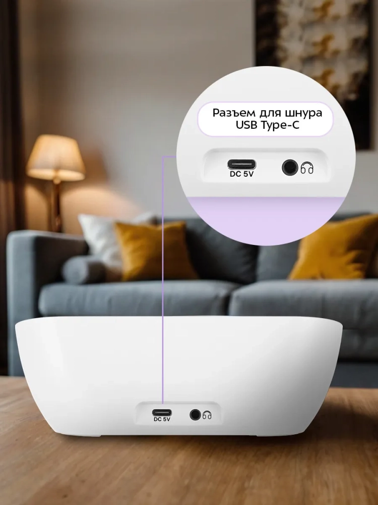 В приборе предусмотрено 8 вариантов белого шума, 8 вариантов звуков вентилятора и 8 естественных звуков (шум в кафе, стрекот сверчков, треск костра, звуки дождя, гром, журчание воды, пение птиц, звук утра в деревне). У прибора есть разъем для наушников (наушники в комплект не входят).