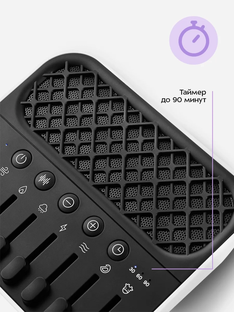 Вы можете включить непрерывную работу прибора или установить таймер на 30, 60 или 90 минут. По истечении таймера устройство автоматически выключится.