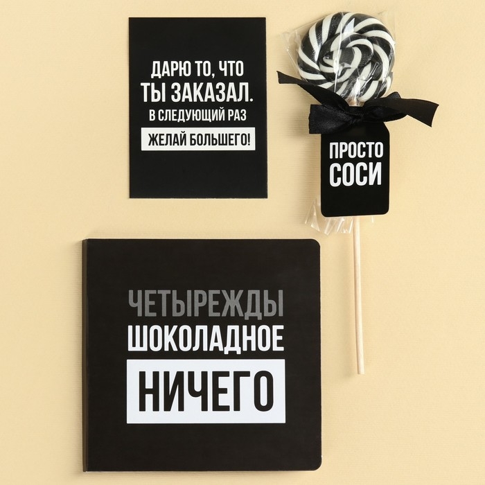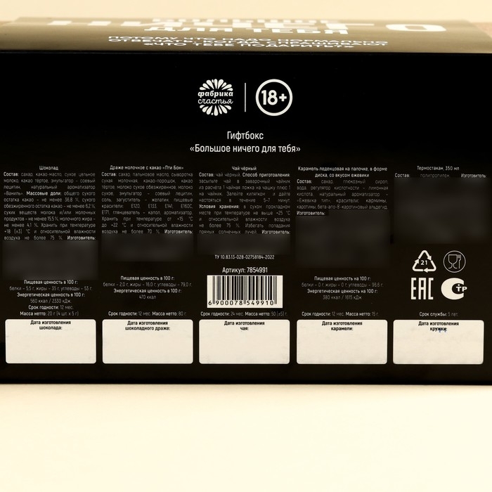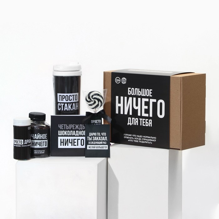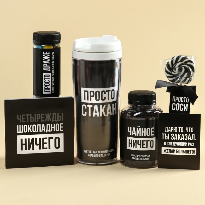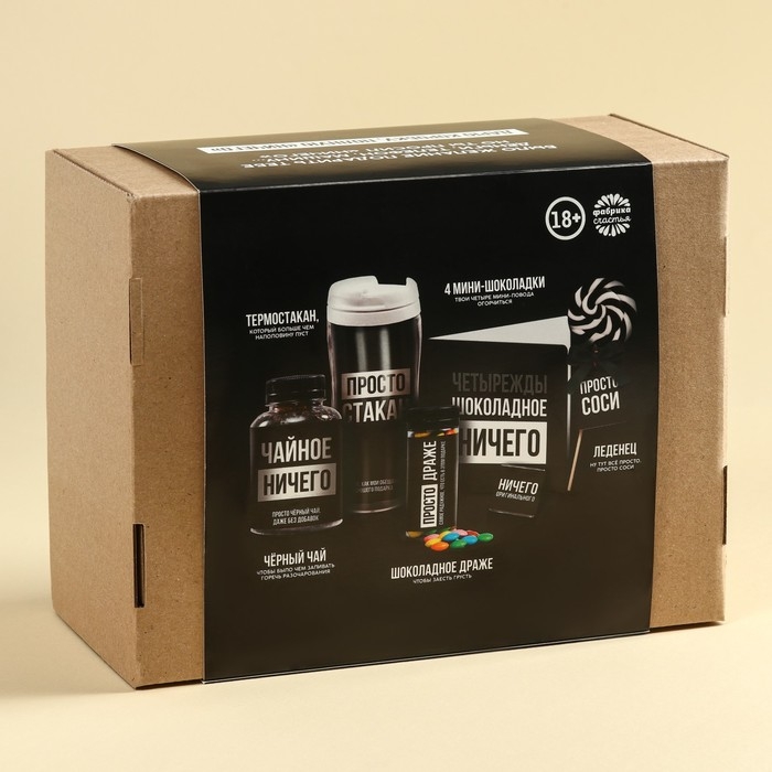 Гифтбокс «Ничего»: чай чёрный 50 г., драже 80 г., молочный шоколад 20 г., термостакан 350 мл., леденец 15 г.