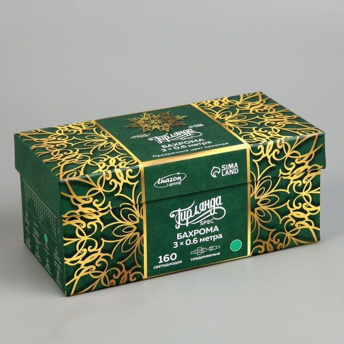 Гирлянда «Бахрома» 3 × 0.6 м, IP44, УМС, прозрачная нить, 160 LED, свечение зелёное, мерцание белым, 220 В