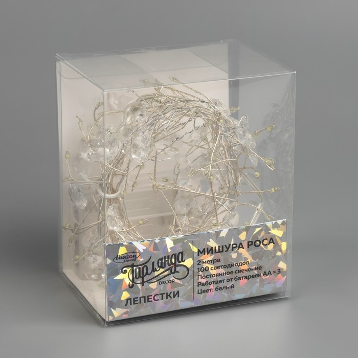 Гирлянда «Мишура» 2 м роса с насадками «Лепестки», IP20, серебристая нить, 100 LED, батарейки ААх3 (нет в комплекте), свечение белое