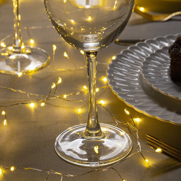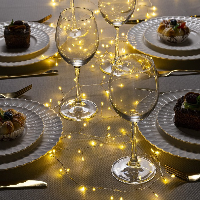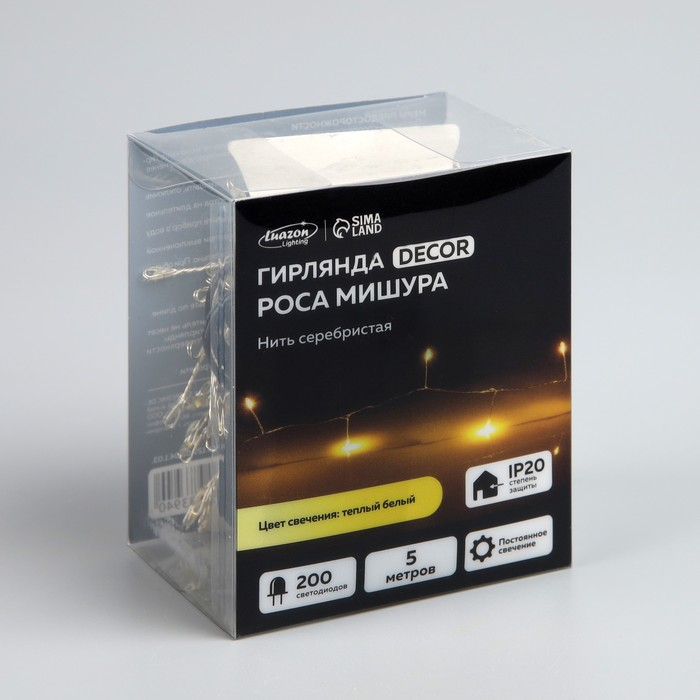 Гирлянда «Мишура» 5 м роса, IP20, серебристая нить, 200 LED, свечение тёплое белое, 12 В