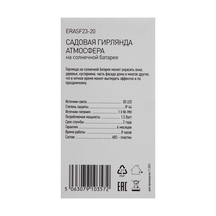 Садовая гирлянда Атмосфера на солнечной батарее 7,8 м (длина рабочей части 5,8 метров) 2 режима 30 LED ЭРА ERASF23-20