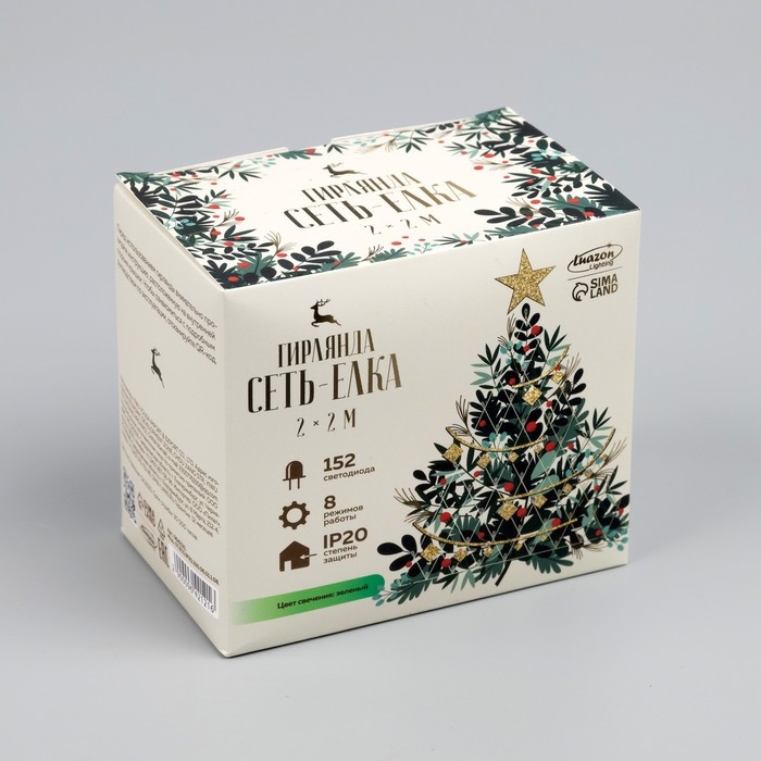 Гирлянда «Сеть-ёлка» 2 × 2 м, IP20, тёмная нить, 152 LED, свечение зелёное, 8 режимов, 220 В