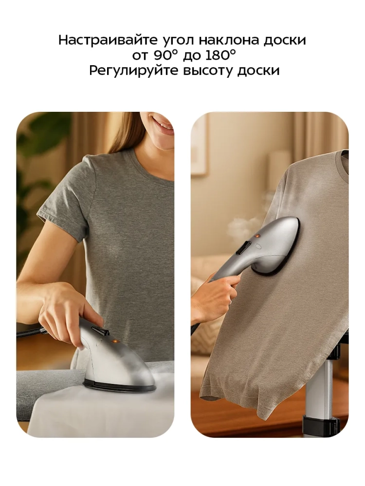 Гладильная доска имеет не только горизонтальное и вертикальное положение, но и может менять наклон от 90° до 180°. Вещи удобно разложить на гладильной доске или закрепить вешалку с одеждой на держателе вешалки гладильной доски. Таким образом вам не придется перевешивать одежду с вешалок, на которых она хранится в шкафу.