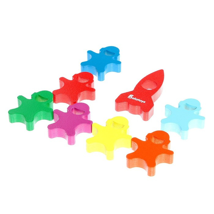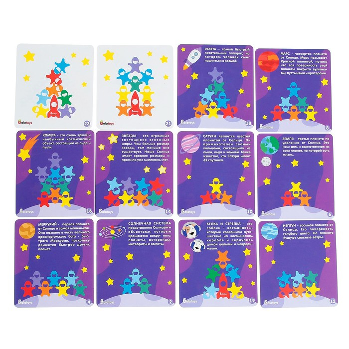 - Набор включает 24 карточки с заданиями и 21 фигурку космонавта различных цветов.