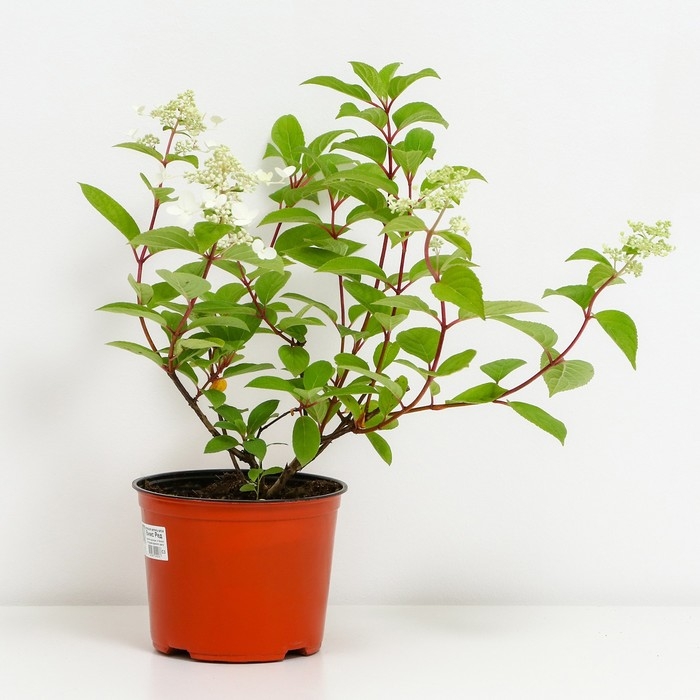 Гортензия метельчатая «Вимс Ред» - саженец высотой 50-60 см в горшке диаметром 15 см. Гортензия метельчатая - кустарник высотой до 2 м. Крона широко раскидистая. Листва темно-зеленая. Цветки собраны в соцветия-метёлки длиной до 30 см, сначала белые, а со временем розовеют, образуются на побегах текущего года. Для обильного цветения рекомендуется проводить ежегодную весеннюю обрезку до начала вегетации. Светолюбива, но может расти и в полутени. Нуждается во влажной и плодородной почве. Лучше растет на кислых почвах. Зимостойка (до -25˚С). Вимс Ред - кустарник высотой до 1,5 м. Побеги бордово-красного цвета. Соцветия конические. Цветки белые, во время цветения меняют белый цвет на розовый, а затем на красный. Цветет с июня до поздней осени.