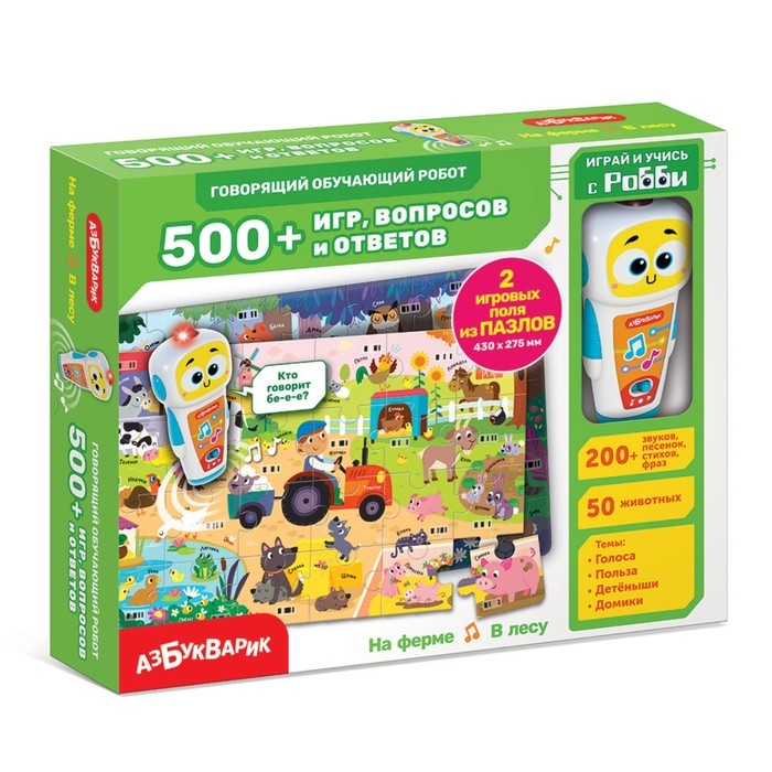 В игровом наборе «На ферме. В лесу» ребёнок найдёт говорящего робота со сканером штрихкодов и 2 пазла из 24 и 35 элементов.