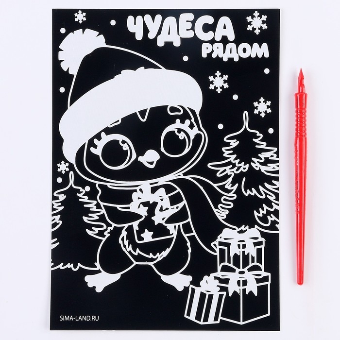 Гравюра на новый год «Пингвин с подарками», с цветной основой, А5