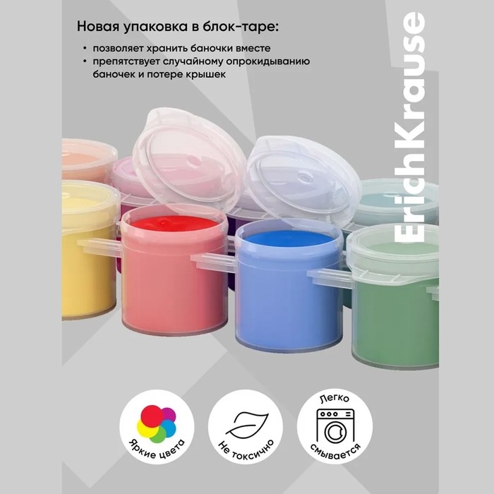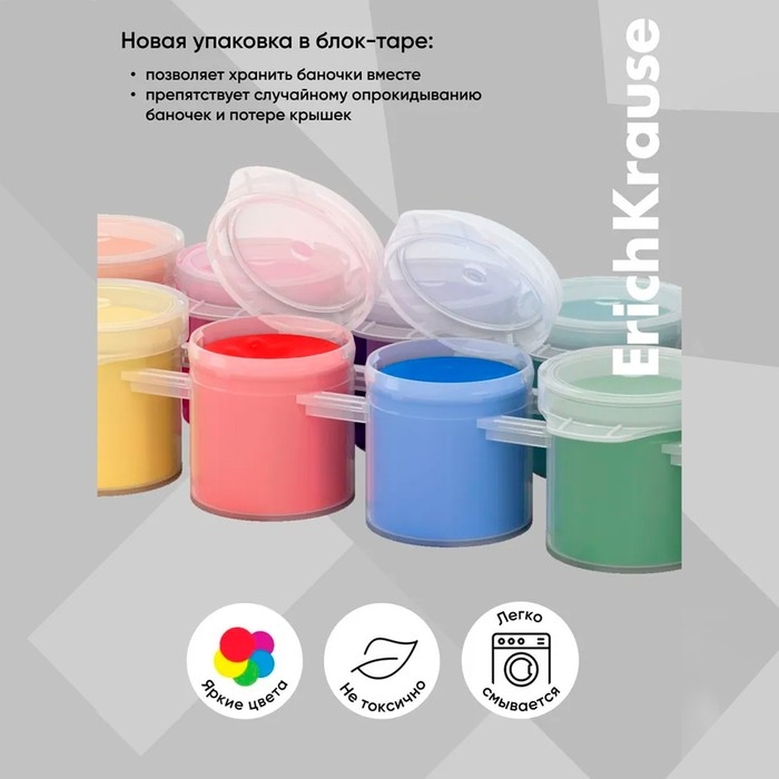 - Безопасная гуашь ErichKrause® на водной основе, легко смывается с рук и отстирывается с большинства видов ткани и бытовых поверхностей, она не токсична, изготавливается из экологичных материалов.
