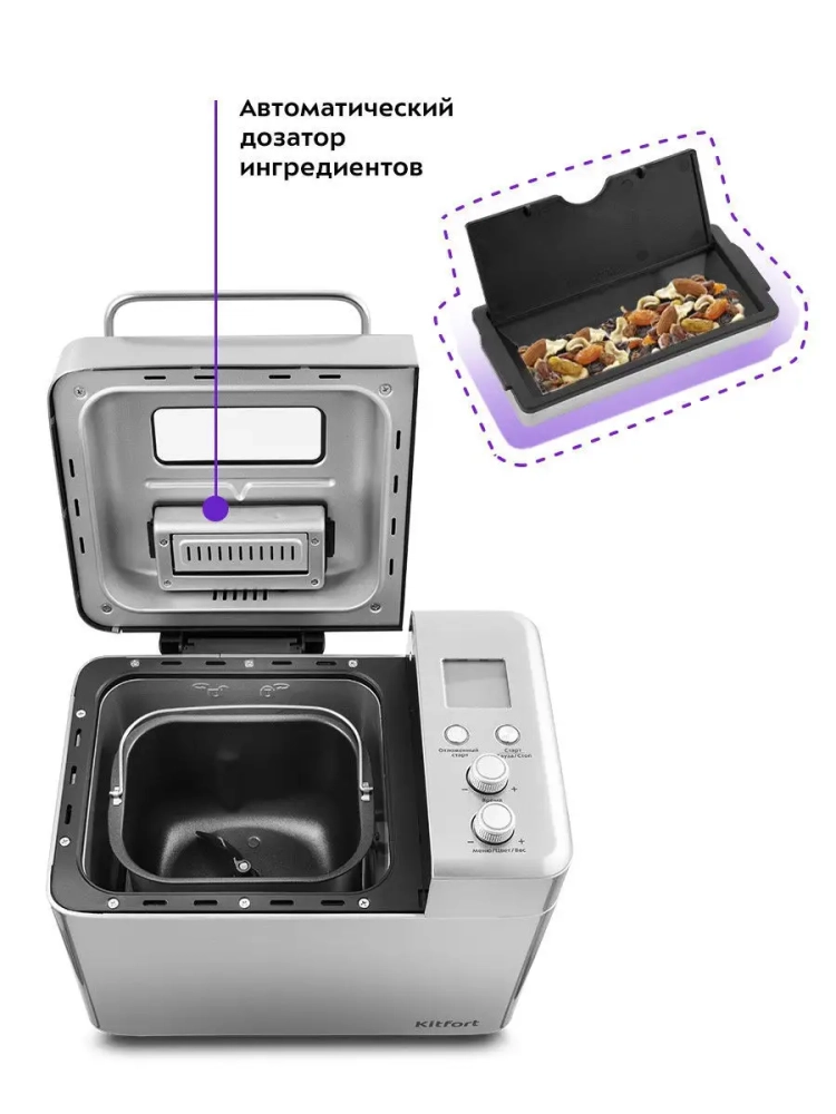 Хлебопечь Kitfort КТ-304 позволяет готовить различные виды хлеба, джемы и десерты, йогурты, а также различные виды теста. Она имеет стильный металлический корпус и обладает всеми прогрессивными функциями для удобного и приятного процесса приготовления.