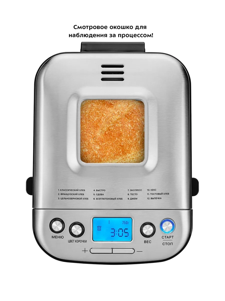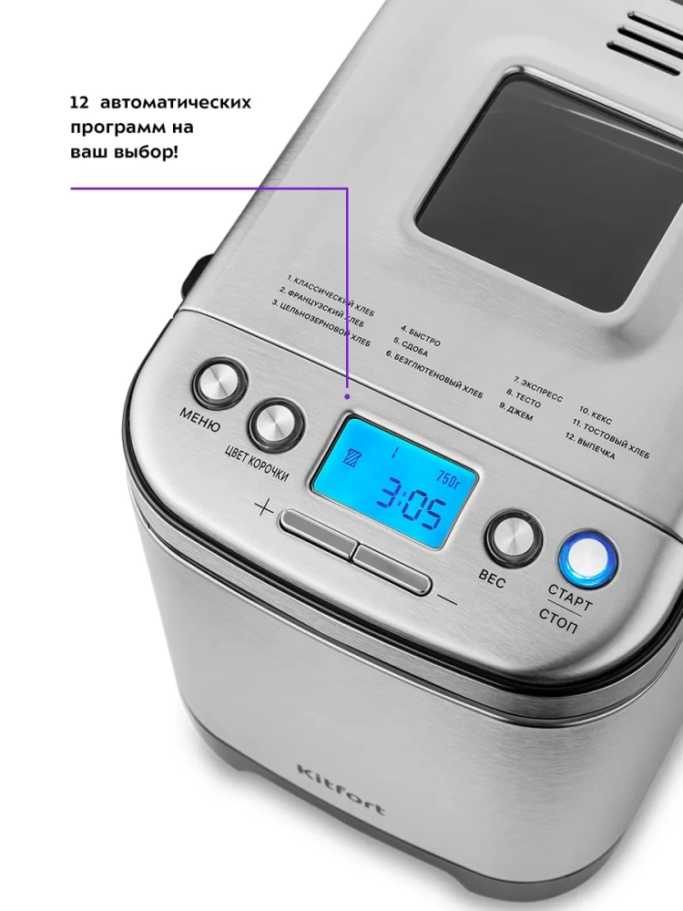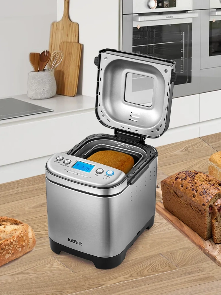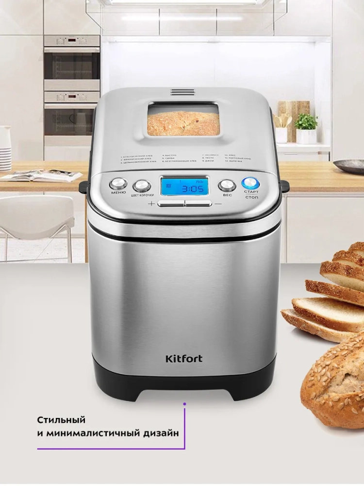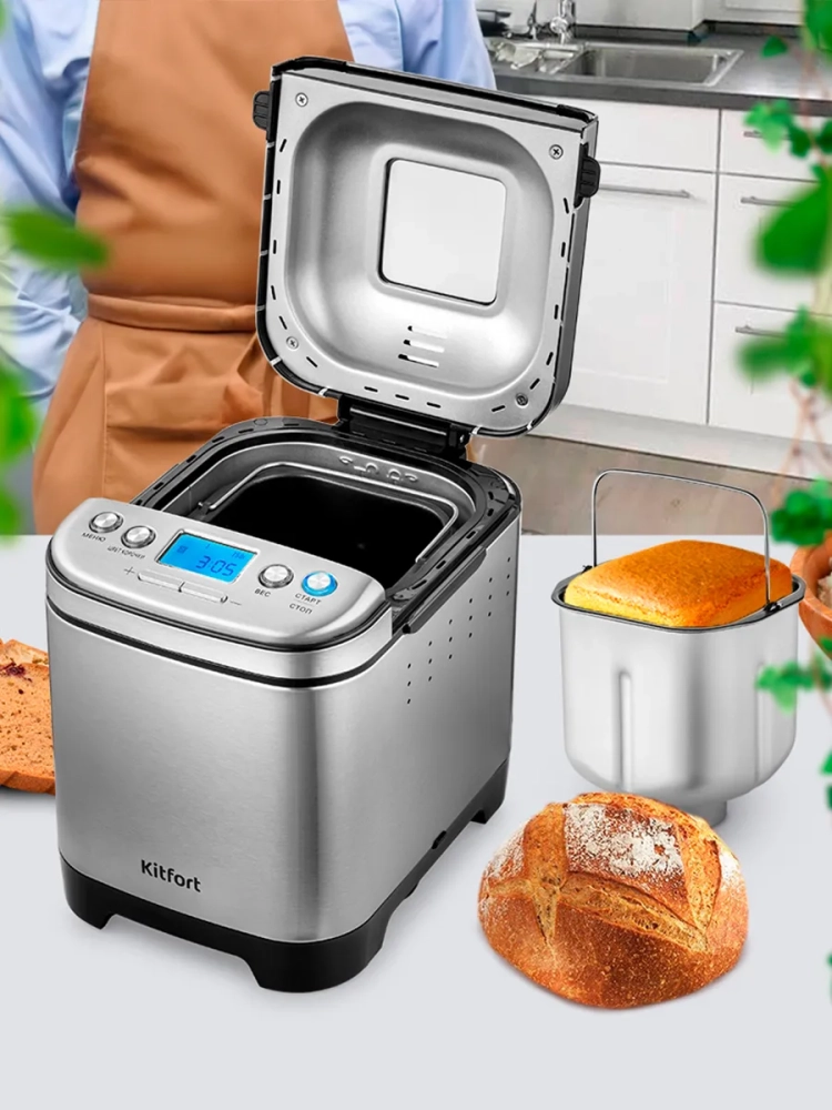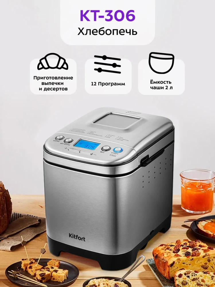 Хлебопечь Kitfort КТ-306 позволяет готовить различные виды хлеба, джем и кексы, а также различные виды теста. Корпус прибора сделан из сочетания нержавеющей стали и пластика. В верхней крышке есть прозрачное окно, через которое можно наблюдать за процессом приготовления. С помощью 12 автоматических программ вы легко приготовите вкусную домашнюю выпечку, ржаной хлеб, сдобу, джем или десерты, замесите тесто на пироги или пиццу. Вы можете начать приготовление в более позднее время, используя функцию отложенного старта, или, наоборот, воспользоваться программой ускоренной выпечки. Хлебопечь снабжена функцией выбора веса готового продукта и цвета корочки в соответствии с вашими вкусовыми предпочтениями. Во время приготовления вы можете добавить в тесто дополнительные ингредиенты, например, цукаты или орехи. Хлебопечь обладает энергонезависимой памятью. При отключении электропитания во время работы программы приготовления настройки сохраняются в памяти прибора на 10 минут. При возобновлении электропитания выполнение программы продолжится автоматически. Если электропитание отсутствует более 10 минут — настройки сбрасываются, и вам необходимо будет запустить программу заново. Функция поддержания температуры готовых блюд сохраняет выпечку свежей и горячей в течение одного часа после завершения работы автоматической программы.