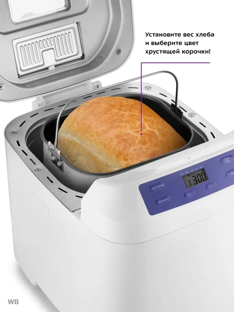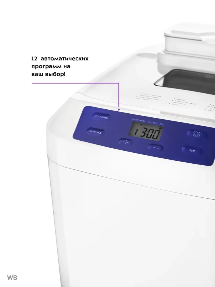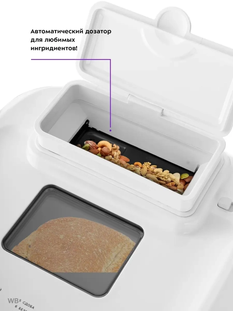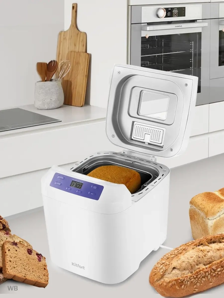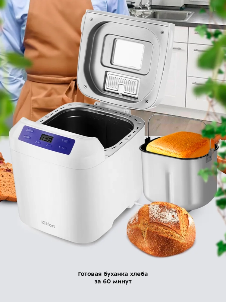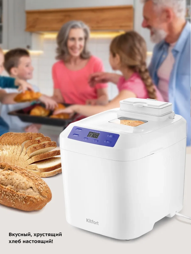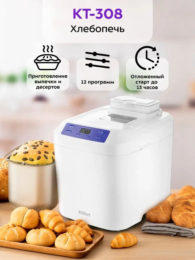 Хлебопечь Kitfort КТ-308 позволяет готовить различные виды хлеба, джем и кексы, а также различные виды теста. Корпус прибора сделан из пластика. В верхней крышке есть прозрачное окно, через которое можно наблюдать за процессом приготовления. С помощью 12 автоматических программ вы легко приготовите вкусную домашнюю выпечку, ржаной хлеб, сдобу, джем или десерты, замесите тесто на пироги или пиццу. Вы можете начать приготовление в более позднее время, используя функцию отложенного старта, или, наоборот, воспользоваться программой ускоренной выпечки. Хлебопечь снабжена функцией выбора веса готового продукта и цвета корочки в соответствии с вашими вкусовыми предпочтениями. В крышку установлен автоматический дозатор для добавления в выпечку дополнительных ингредиентов во время приготовления. Хлебопечь обладает энергонезависимой памятью. При отключении электропитания во время работы настройки приготовления сохраняются в памяти прибора на 10 минут. При возобновлении электропитания выполнение программы продолжится автоматически. Если электропитание отсутствует более 10 минут - настройки сбрасываются, и вам необходимо будет запустить программу заново. Функция поддержания температуры готовых блюд сохраняет выпечку свежей и горячей в течение одного часа после завершения работы автоматической программы.