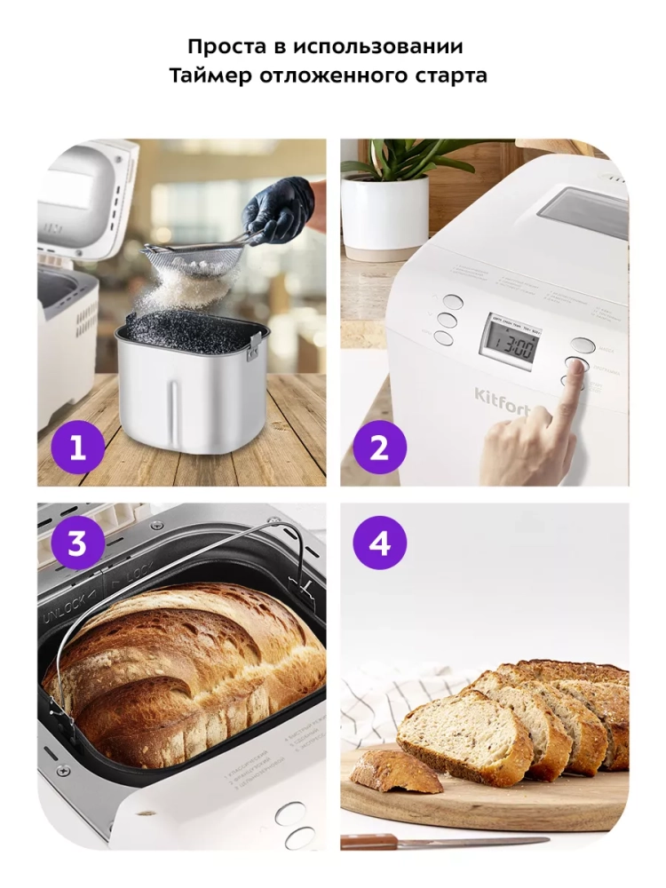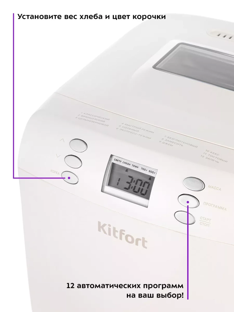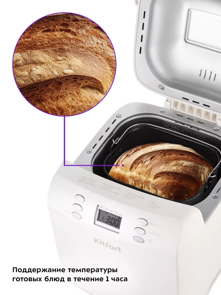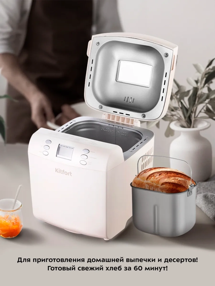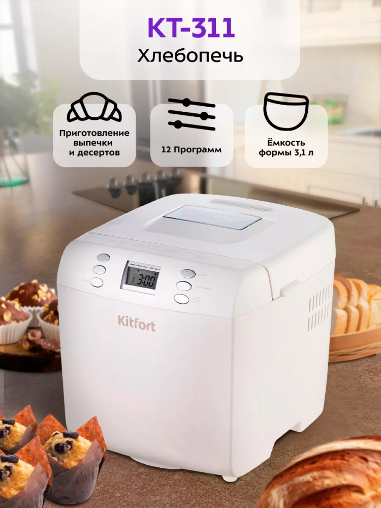 Хлебопечь Kitfort КТ-311 позволяет готовить различные виды хлеба, джем и кексы, а также тесто. Корпус прибора сделан из пластика. В крышке есть прозрачное окно, через которое можно наблюдать за процессом приготовления.