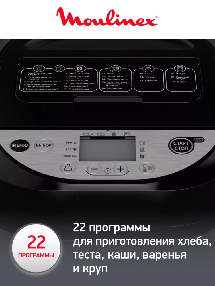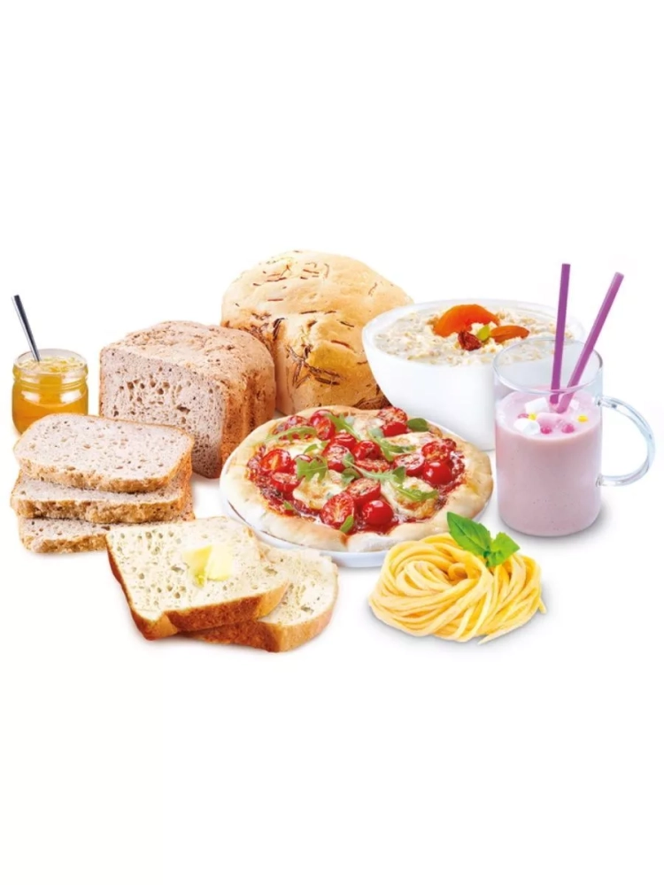 Приготовьте в ней тесто для пиццы и пасты, варенье, кашу или крупы, а также молочные продукты. 22 автоматические программы включают три программы для безглютенового теста, с помощью которых вы приготовите большое разнообразие хлеба и пирогов, рецепты которых есть в книге рецептов для хлебопечи, а также три дополнительные программы для приготовления в хлебопечке йогурта и других блюд на основе молока.
