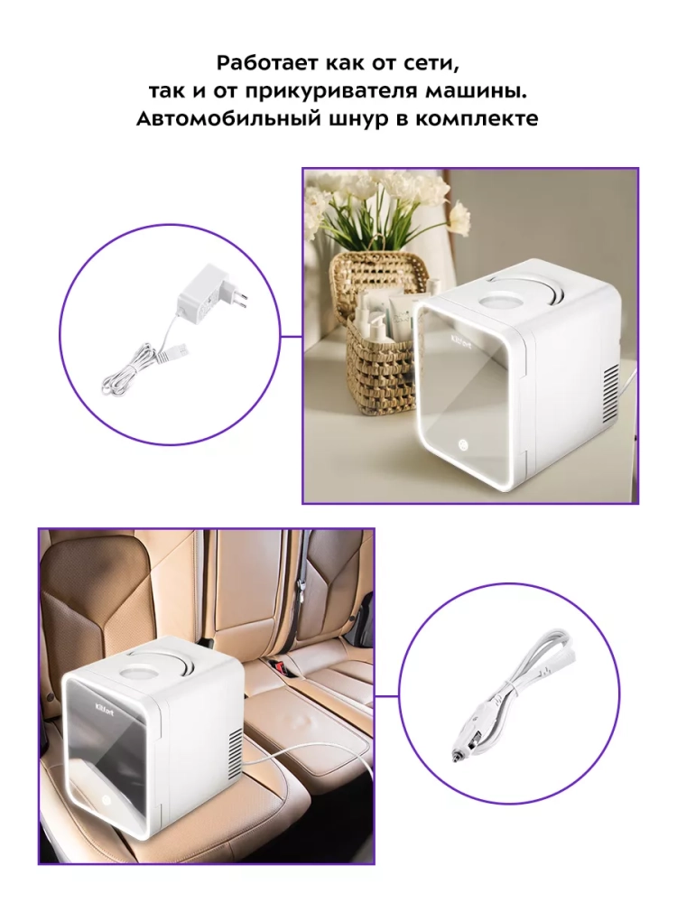 Благодаря наличию блока питания и автомобильного шнура в комплекте вы можете использовать холодильник дома или взять его в поездку на машине. Дверная полка, ящик и полка холодильной камеры позволят вам рассортировать косметику.