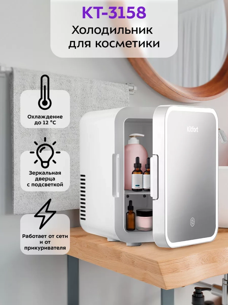 В холодильнике для косметики Kitfort KT-3158 поддерживается оптимальная температура для хранения косметических средств: кремов, сывороток, лосьонов, масок. Косметику необходимо хранить при температуре 5–25 °С, оптимальной считается температура 10–18 °С.