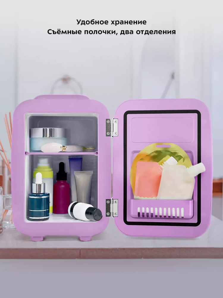 Благодаря наличию сетевого и автомобильного шнура в комплекте вы можете использовать холодильник дома или взять его в поездку на машине. Дверная полка и полка холодильной камеры позволят вам рассортировать косметику.