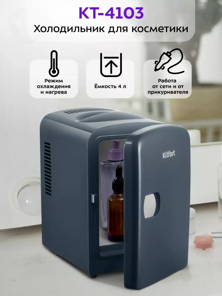 В холодильнике для косметики Kitfort KT-4103 поддерживается оптимальная температура для хранения косметических средств: кремов, сывороток, лосьонов, масок. Также у устройства есть режим нагрева, который подойдет, например, для разогрева восковых полосок, специальных масел или масок перед их использованием.