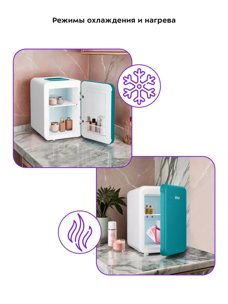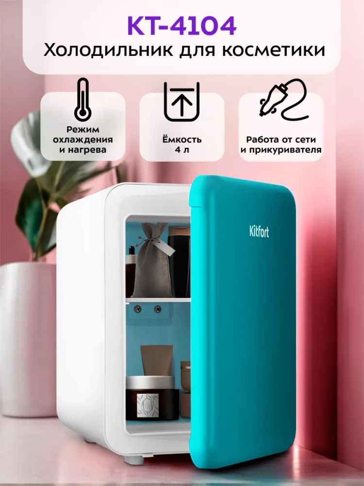 В холодильнике для косметики Kitfort KT-4104 поддерживается оптимальная температура для хранения косметических средств: кремов, сывороток, лосьонов, масок. Также у устройства есть режим нагрева, который подойдет, например, для разогрева восковых полосок, специальных масел или масок перед их использованием.