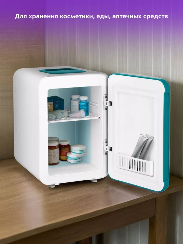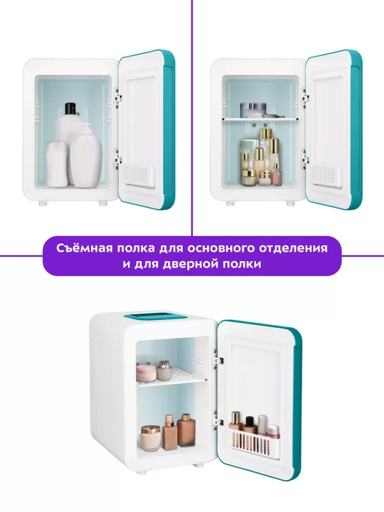 Благодаря наличию сетевого и автомобильного шнура в комплекте вы можете использовать холодильник дома или взять его в поездку на машине. Дверная полка и полка холодильной камеры позволят вам рассортировать косметику.