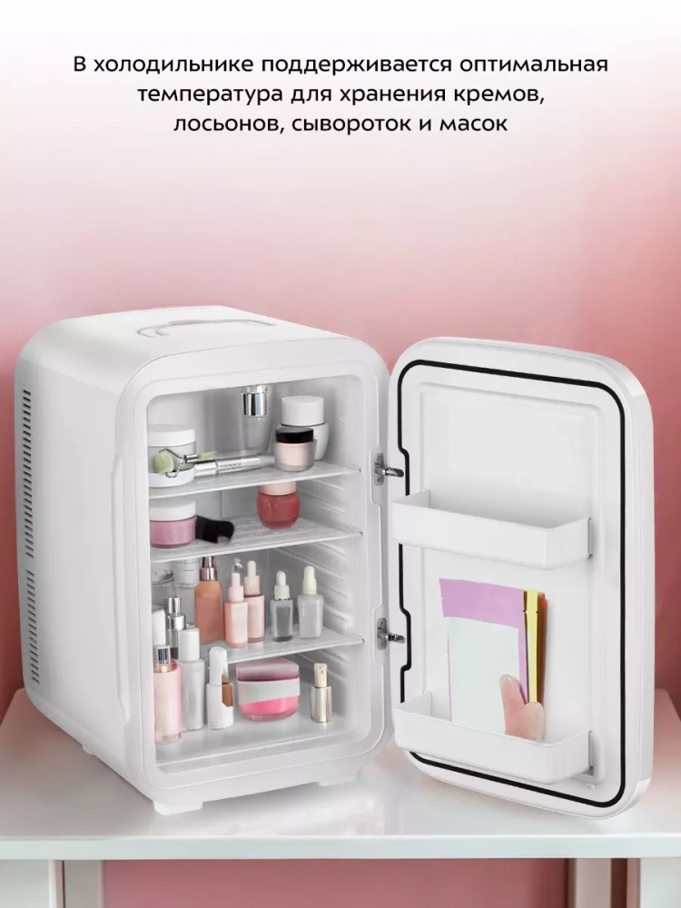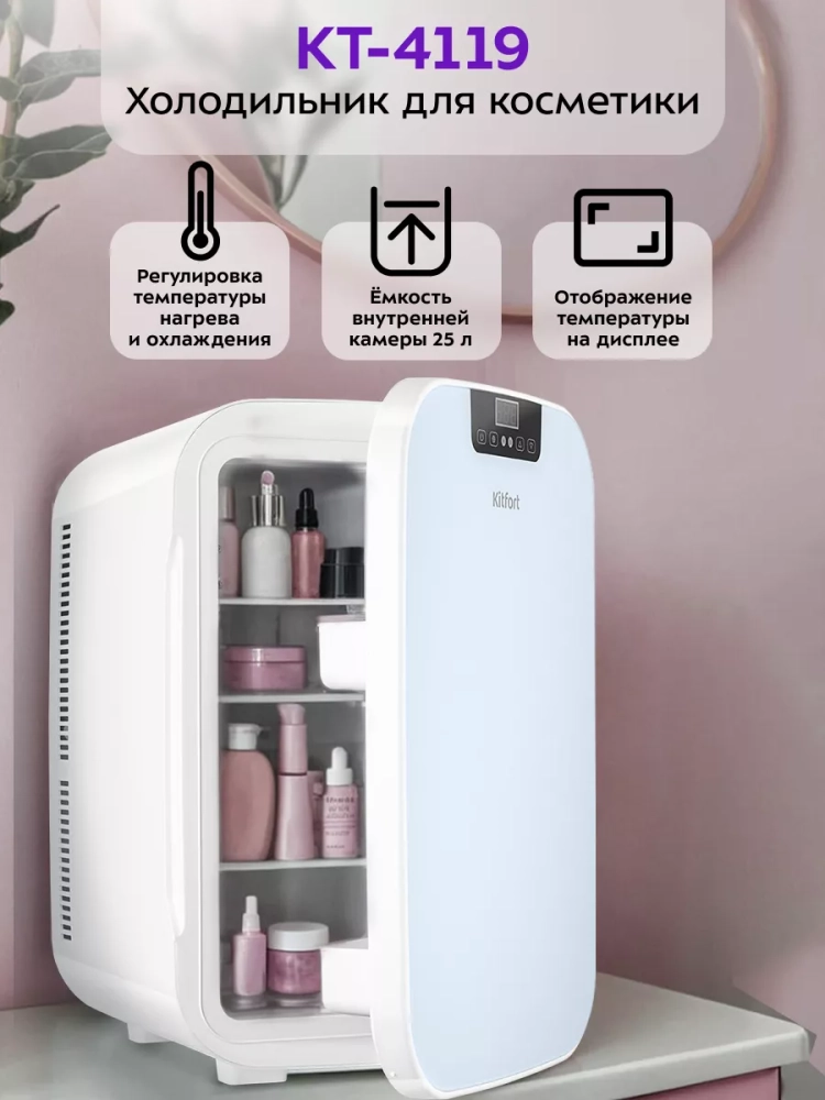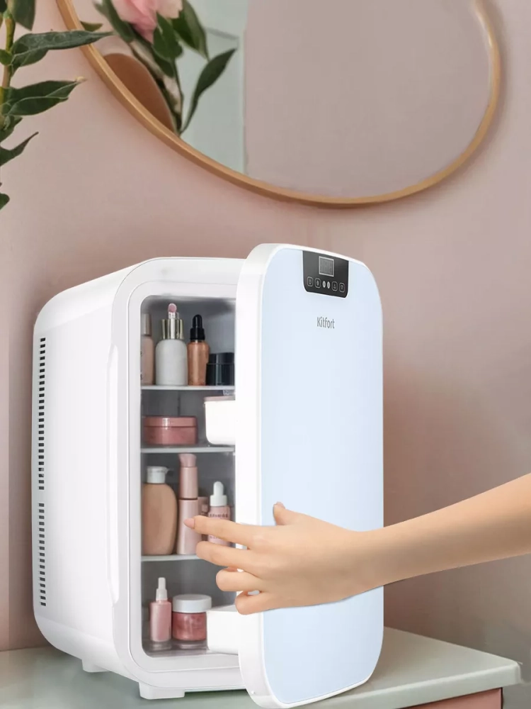 В холодильнике для косметики Kitfort KT-4119 поддерживается оптимальная температура для хранения косметических средств: кремов, сывороток, лосьонов, масок, а также для разогрева восковых полосок, специальных масел или масок перед их использованием.