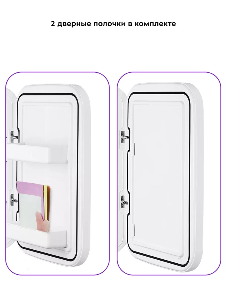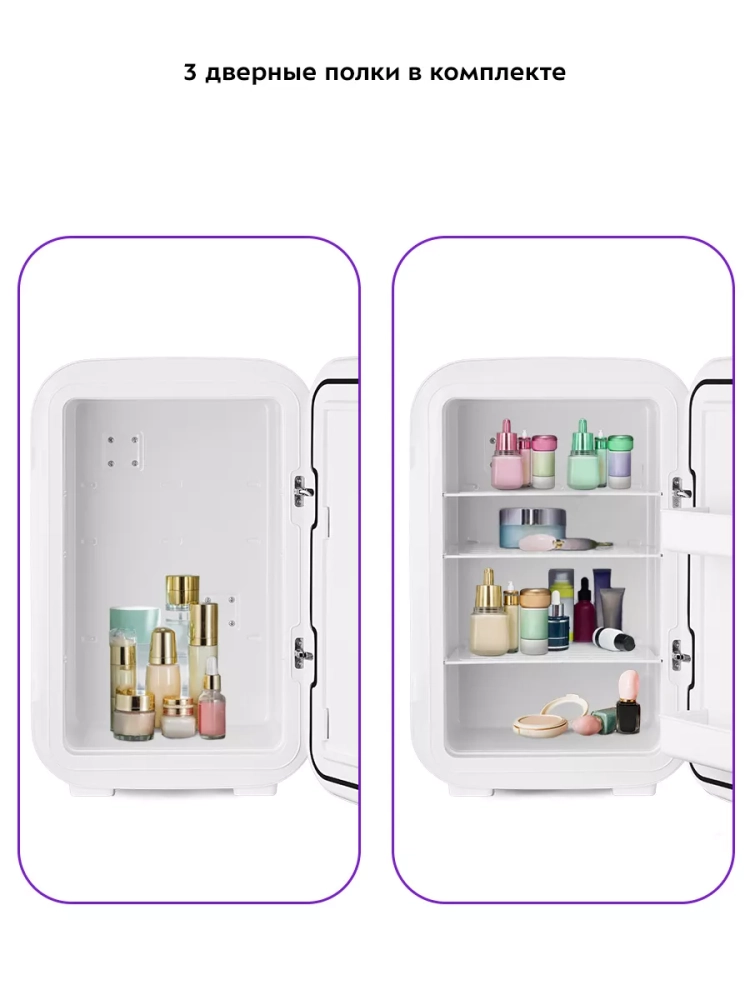 Благодаря наличию сетевого и автомобильного шнура в комплекте вы можете использовать холодильник дома или взять его в поездку на машине. Дверная полка и полки холодильной камеры позволят вам рассортировать косметику.