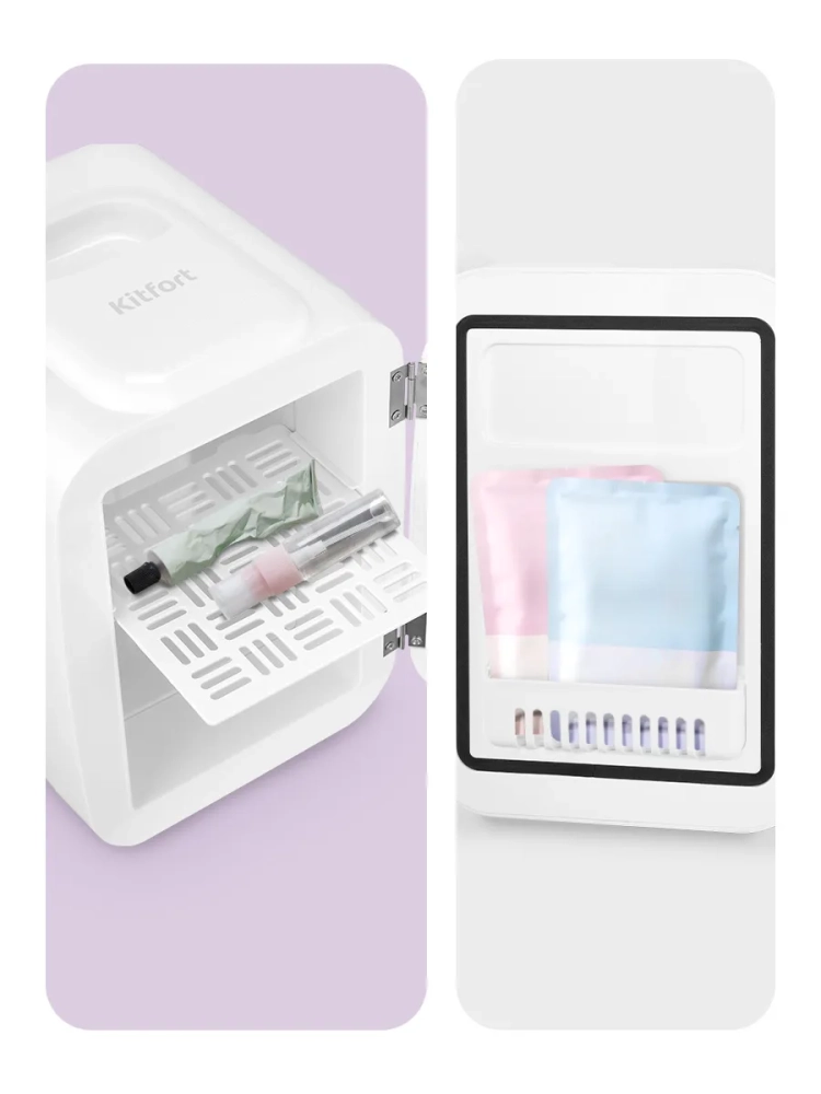 В холодильнике для косметики Kitfort KT-4149 поддерживается оптимальная температура для хранения косметических средств: кремов, сывороток, лосьонов, масок. Также у устройства есть режим нагрева, который подойдет, например, для разогрева восковых полосок, специальных масел или масок перед их использованием.