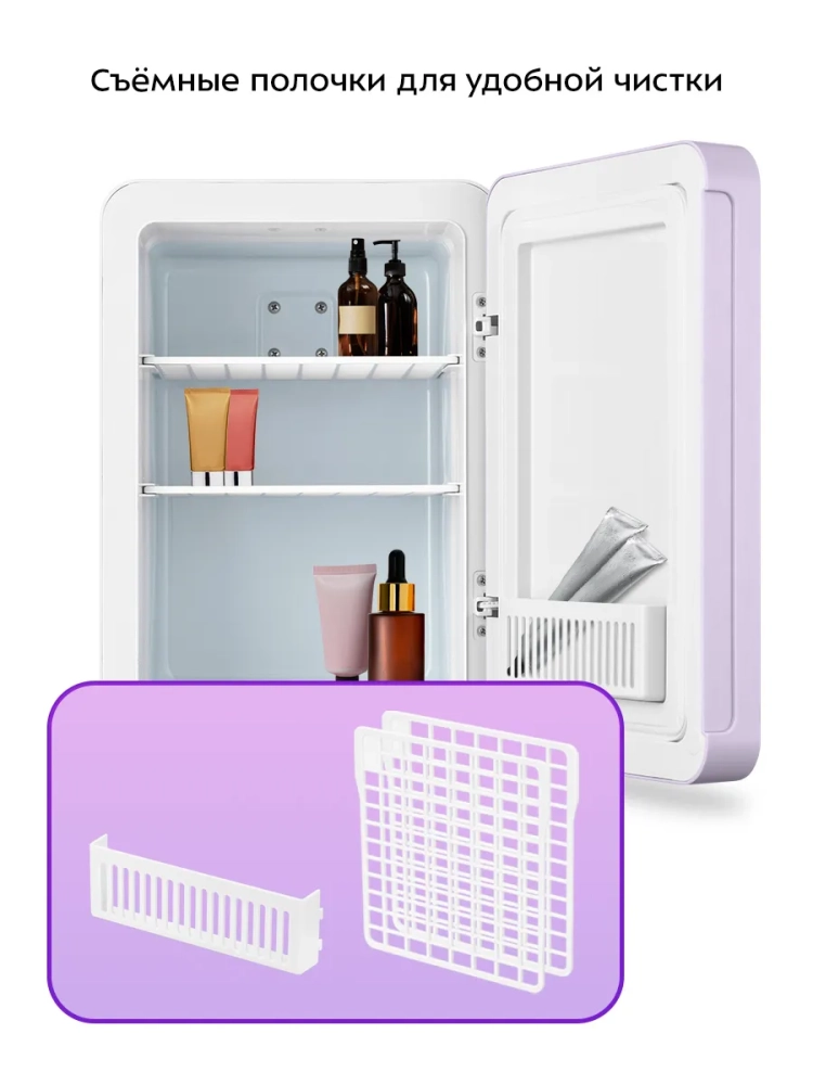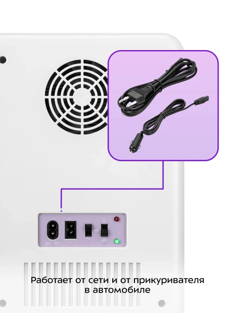 Благодаря наличию сетевого и автомобильного шнура в комплекте вы можете использовать холодильник дома или взять его в поездку на машине. Дверная полка и полки холодильной камеры позволят вам рассортировать косметику.