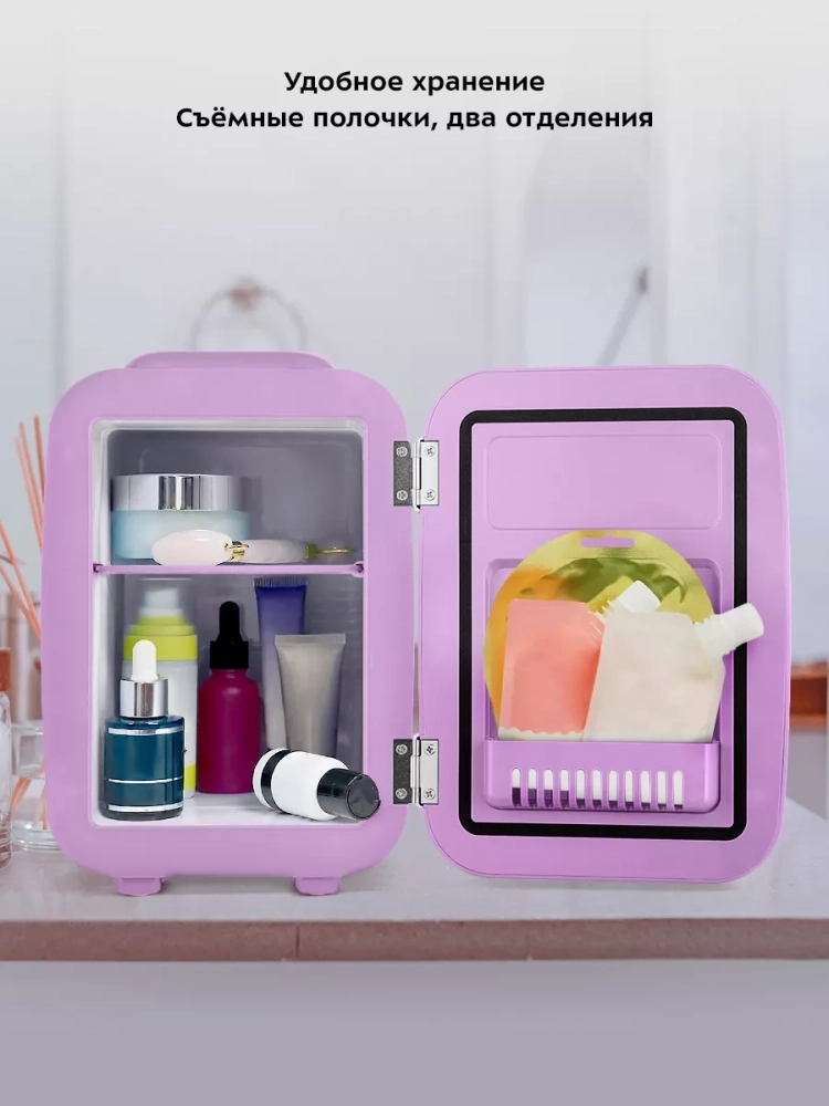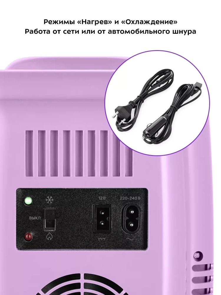 В холодильнике для косметики Kitfort KT-3163 поддерживается оптимальная температура для хранения косметических средств: кремов, сывороток, лосьонов, масок. Косметику необходимо хранить при температуре от 5 до 25 *С, оптимальной считается температура 10–18 *С. Также у устройства есть режим нагрева, который подойдет, например, для разогрева восковых полосок, специальных масел или масок перед их использованием. Благодаря наличию сетевого и автомобильного шнура в комплекте вы можете использовать холодильник дома или взять его в поездку на машине. Дверная полка и полка холодильной камеры позволят вам рассортировать косметику. Поддерживание постоянной температуры особенно важно для натуральной, органической косметики и косметики домашнего производства. Кроме того, в холодильнике рекомендуется хранить косметику с нестабильными витаминами, например, сыворотки и крема с витамином С. Также вы можете хранить в холодильнике лекарства и аптечные мази в соответствии с инструкцией на упаковке. Хранение в холодильнике средств, помогающих справиться с отечностью по утрам, усилит их косметическое действие благодаря приятному охлаждающему эффекту. С такой же целью рекомендуется хранить в холоде роликовые массажеры. Во время жаркой погоды вы можете убрать в холодильник освежающие спреи. Холодильник для косметики Китфорт KT-3163 легкий и обладает компактными размерами, так что вы сможете поставить его на туалетный столик или в ванную. Питание: от сети: ~220–240 В, 50/60 Гц; от прикуривателя: =12 В, 4 А. Мощность: 40 Вт. Класс защиты от поражения электрическим током: II. Температура охлаждения (ниже окружающей среды): 16–20 *С. Максимальная температура охлаждения: 0 *С. Температура нагрева: 50–60 *С. Температура не регулируется, холодильник работает в 2-х режимах: охлаждение и нагрев. Материал термоизоляции: пенополистирол. Энергопотребление: 394,2 кВт*ч/год. Длина сетевого шнура: 1,8 м. Длина автомобильного шнура: 2 м.