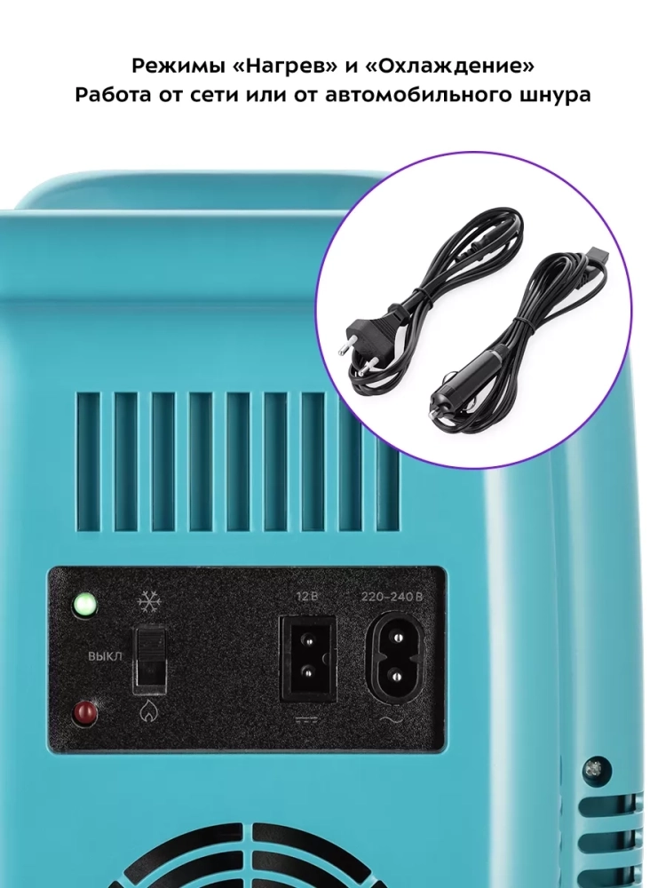Питание: от сети: ~220–240 В, 50/60 Гц; от прикуривателя: =12 В, 4 А. Мощность: 40 Вт. Класс защиты от поражения электрическим током: II. Температура охлаждения (ниже окружающей среды): 16–20 *С. Максимальная температура охлаждения: 0 *С. Температура нагрева: 50–60 *С. Температура не регулируется, холодильник работает в 2-х режимах: охлаждение и нагрев. Материал термоизоляции: пенополистирол. Энергопотребление: 394,2 кВт*ч/год. Длина сетевого шнура: 1,8 м. Длина автомобильного шнура: 2 м.