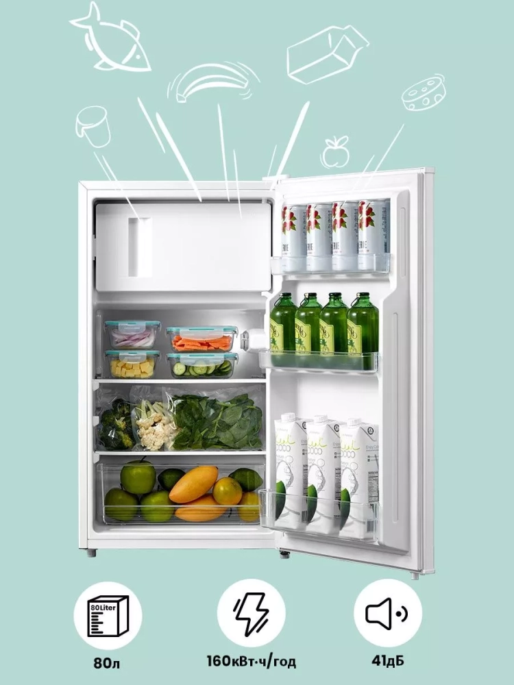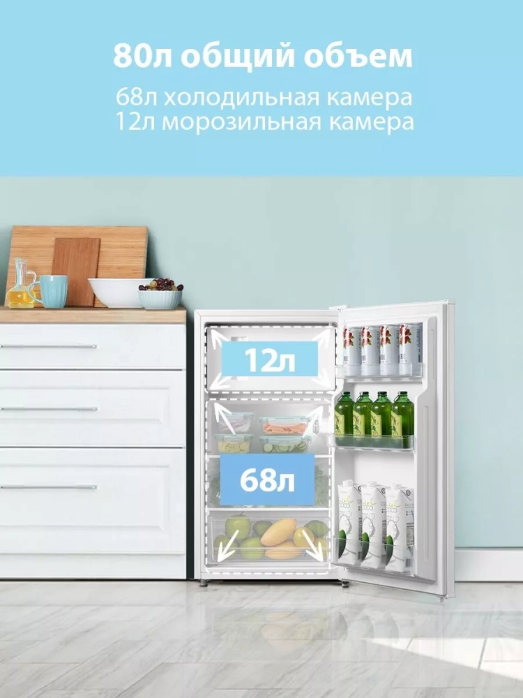 Холодильник имеет две камеры общим объемом 80 литров. Объем холодильной камеры составляет 68 литров, а морозильной - 12 литров. Это позволяет хранить различные продукты при требуемой температуре.