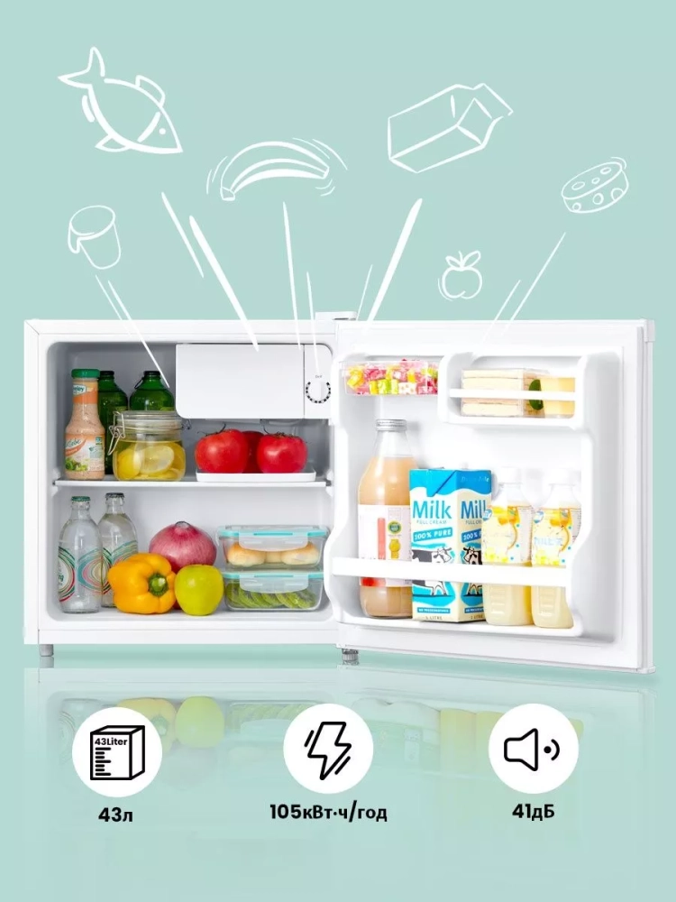 Компактный размер холодильника и его небольшой вес облегчают его перемещение и установку в любом удобном для вас месте. Белый цвет корпуса позволяет прибору органично вписаться в любой интерьер кухни.