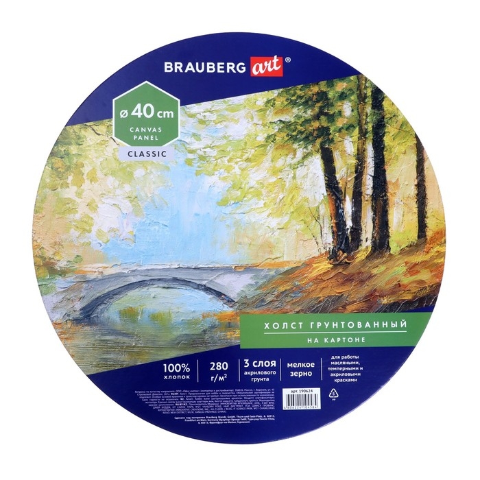Холст Круглый на картоне d-40 см, хлопок 100%, акриловый грунт, мелкое зерно, Brauberg