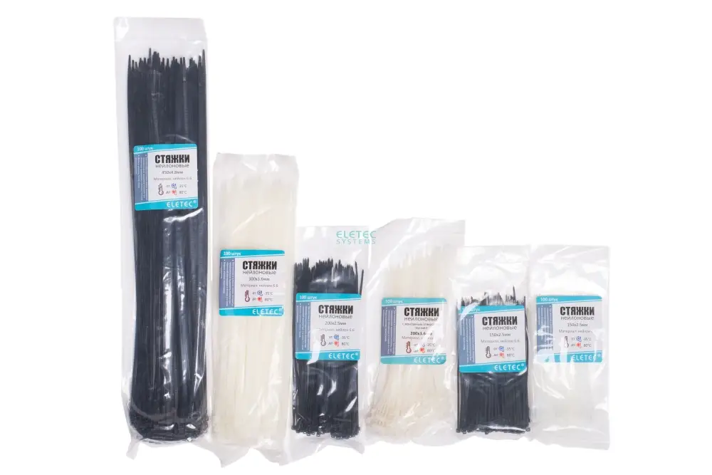 Крепежные нейлоновые хомуты представляют собой цельную полоску из гибкого и прочного полиамида, на одном из концов которой расположена головка с замковым устройством, а по всей длине нанесены зубцы, позволяющие при малом усилии легко затянуть хомут.