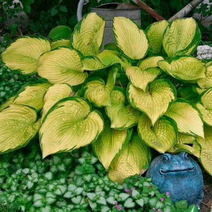 Хоста Голд Стандарт (ML) - Весной листья светло-зеленого цвета с темно-зеленой каймой по краю. Затем центр листа становится золотистым, и хоста приобретает более яркую окраску. Яркость зависит от количества солнца. При полной освещенности золотистый превращается в почти белый. Цветки - светло-лавандовые. Куст высотой до 60-70 см. Ширина куста до 90-120 см. Период цветения июль-август. Зона зимостойкости: 3 (-40 ° С)Хоста - многолетнее травянистое растение семейства Лилейные. Родиной хосты является Китай и Япония. Это декоративно-лиственный многолетник. Хосты любят за их эффектную листву, которая у различных видов и сортов достаточно сильно отличается. Листья хосты расположены на черешках и образуют крупную прикорневую розетку. Они могут иметь различную форму и окраску, быть однотонными или с окаймлением, с восковым налетом и без него, с прямым или волнистым краем. Цветет хоста в июле-августе. Цветение наступает летом и длится 2-3 недели. Сиреневые, лиловые, розовые или белые цветки собраны в в кистевидные соцветия часто на высоких цветоносах. Форма цветков может быть колокольчатой или воронковидной. Высота больших хост достигает от 64 до 120 см, а диаметр круглого листа от 24 до 34 см. Большие хосты в отличии от гигантских имеют огромное разнообразие по окраске и форме листьев. В саду они также как и гигантские обычно используются для создания центра композиции.