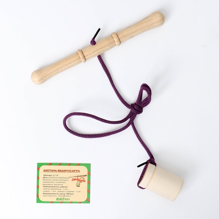 - Цель игры — аккуратно намотать шнурок и достать ведёрко. Для самых ловких игроков его можно наполнить какими-нибудь предметами, усложнив тем самым основную задачу.